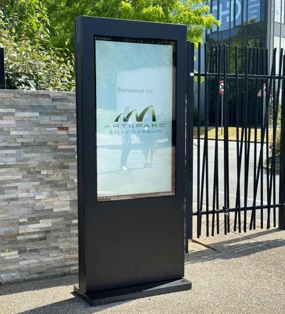 Découvrez le totem tactile outdoor de Tacteasy Technology, parfait pour un usage extérieur professionnel. Disponible en 32″, 43″, 49″, 55″ et 65″, avec écran Full HD ou 4K et luminosité 2000 cd/m², il offre une visibilité optimale même en plein soleil.